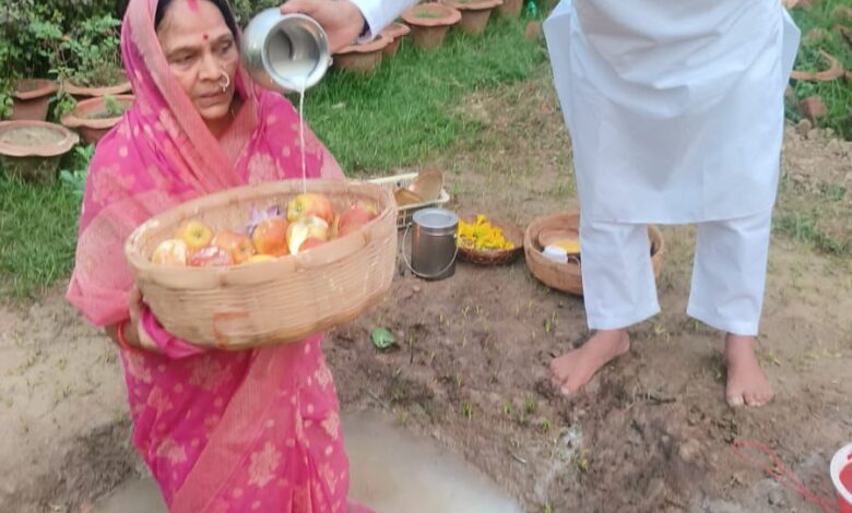 घर के आंगन में निर्मित कच्चे तालाब में अर्घ्य अर्पण के समय श्रद्धा और भक्ति का अद्भुत संगम देखने को मिला।